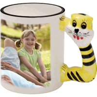 Fotohrnek – bílý, ouško se zvířátkem - Tygr, výška 9 cm, průměr 8 cm, baleno v sáčku s kartičkou do krabičky. Mytí doporučujeme vodou bez agresivních chemických čistících prostředků