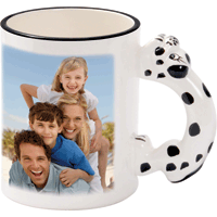 Fotohrnek – bílý, ouško se zvířátkem - Dalmatin, výška 9 cm, průměr 8 cm, baleno v sáčku s kartičkou do krabičky. Mytí doporučujeme vodou bez agresivních chemických čistících prostředků