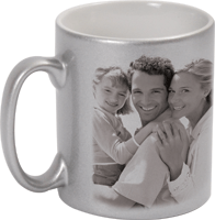 Stříbrný fotohrnek s černo/stříbrným potiskem, výška 9 cm, průměr 8 cm, baleno v sáčku s kartičkou do krabičky. V případě požadavku barevného potisku zrušte v editoru ČB filtr, jedná se o tlačítko ve tvaru čtverce, který je na půl bílý a na půl černý, ovšem je potřeba počítat s tím, že potisk změní barvy díky stříbrnému podkladu. Mytí doporučujeme vodou bez agresivních chemických prostředků
