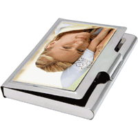 Plechové pouzdro na vizitky o rozměrech 9,3 x 6,3 x 0,9 cm. Maximální rozměr vizitek 9 x 5,5 cm. Rozměry potisku 8,1 x 4,3 cm.