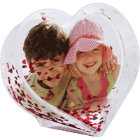 Fotosněžítko ve tvaru srdce se srdíčkovými flitry. Uvnitř je vložena fotografie. Materiál - plast, šířka 9,5 cm, výška 9 cm. Baleno v sáčku do krabičky.